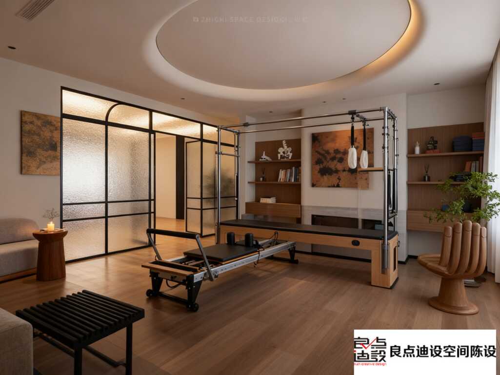 淺木色器械和地板呼應(yīng),金屬配件點綴得恰到好處~既保留了專業(yè)度,又帶著居家般的溫馨感!器械間距留得超合理,轉(zhuǎn)身拉伸都不會碰到,安全感爆棚!